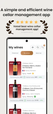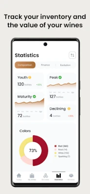 Oeni не е просто инструмент за управление, а ваш финансов съветник за виното. То ви позволява да следите не само развитието на качеството на вашите бутилки, но и тяхната пазарна стойност. Ежемесечно приложението актуализира цените на вашите вина, предоставяйки точна оценка на общата стойност на избата ви. Проследявайте в детайли разходите, свързани с вашите винени инвестиции, и анализирайте капиталовата печалба в реално време. Oeni е незаменим помощник за всеки колекционер, който иска да оптимизира инвестициите си и да извлече максимална полза от своята колекция.