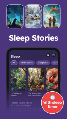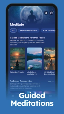 Потопете се в обширна колекция от релаксираща музика – от класически мелодии до нежни китарни и пиано изпълнения, идеални за всеки ваш момент. Подобрете съня си с приспивни песни за бебета, бял шум и естествени звуци като морски вълни, дъжд и птичи песни, които можете да смесвате по свой вкус. Отдайте се на вълшебството на нашите завладяващи истории за сън, създадени да приспиват нежно както малчугани, така и възрастни. За подобряване на фокуса, Serene предлага специално подбрани lo-fi мелодии и амбиентни звуци, докато колекцията ни от медитативни честоти, включително тези, вдъхновени от Никола Тесла и планетарни резонанси, ще задълбочи вашата практика за медитация.
